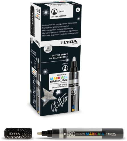 Lyra Graduate Mark All Sparkling is the multi-surface transparent glitter marker that transforms every idea into a sparkling masterpiece. Thanks to its innovative formula of transparent acrylic and mineral glitter, it can be used on all colors in the range and on all surfaces, paintings, and drawings to make them sparkling and glittery (apply when colors are dry). The marker is ready to use, ideal for bringing original and brilliant creations to life; every detail is designed to make your artistic experience fluid and engaging. The absolute charm of sequins in a marker! The water-based ink is odorless and eco-friendly, and contains no microplastics, perfect for those who want to express themselves creatively and responsibly. Get inspired by the videos