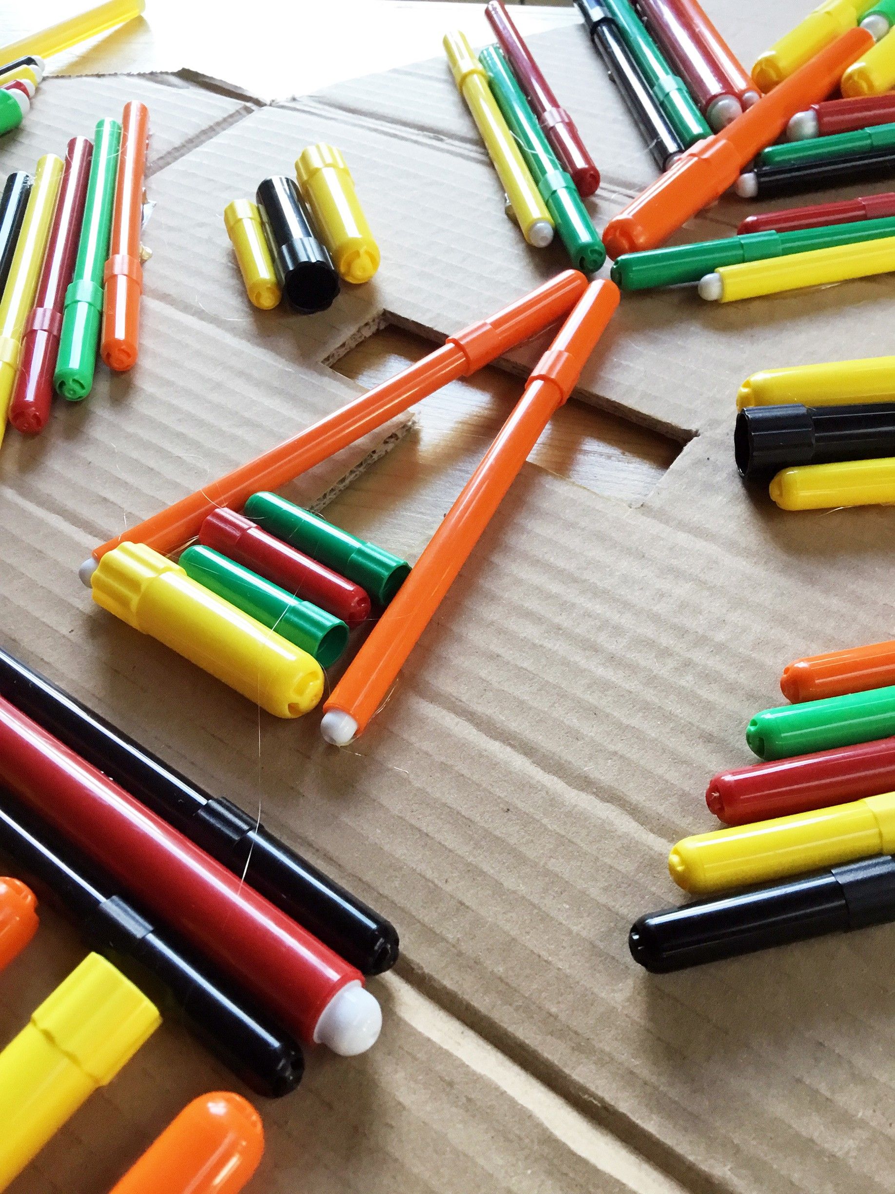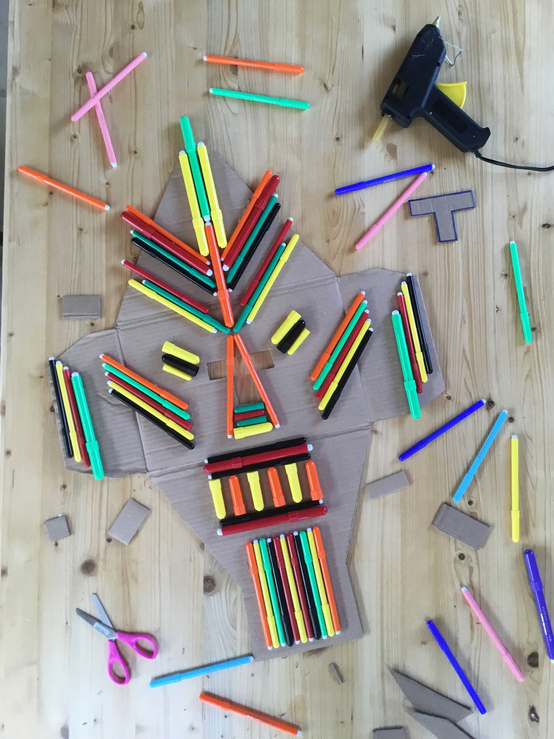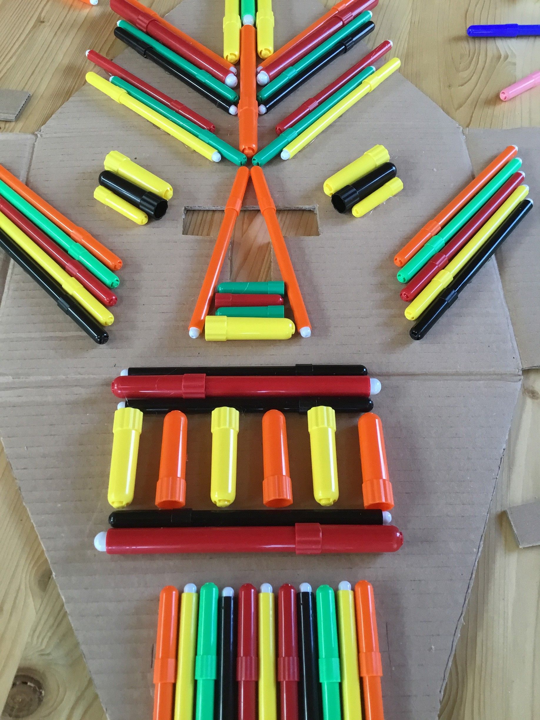 Ed è proprio l’Africa, con le sue famose e variopinte maschere, in questo laboratorio creativo di riuso, ad essere musa ispiratrice, con i suoi colori, l’uso di materiali poveri, la composizione grafica dal segno forte e intenso, così come lo sono i colori dei corpi e dei cappucci dei pennarelli.