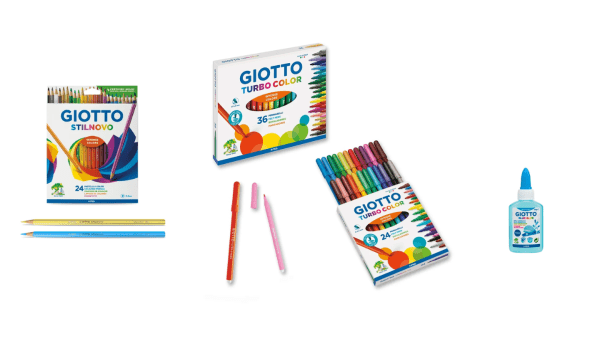 Le matite Giotto Stilnovo sono perfette per chi ama annotare pensieri e disegnare dettagli con precisione, grazie alla loro scrittura morbida e scorrevole che rende ogni parola un piacere da tracciare. I pennarelli Giotto Turbo Color, invece, sono ideali per colorare con tratti intensi e vivaci, capaci di trasformare le pagine in veri e propri arcobaleni di emozioni. Per chi vuole aggiungere elementi come fotografie, ritagli di carta o piccoli simboli, la colla Giotto Blue Glue si rivela indispensabile: facile da stendere, si asciuga in modo trasparente e mantiene tutto ben saldo senza rovinare la carta.